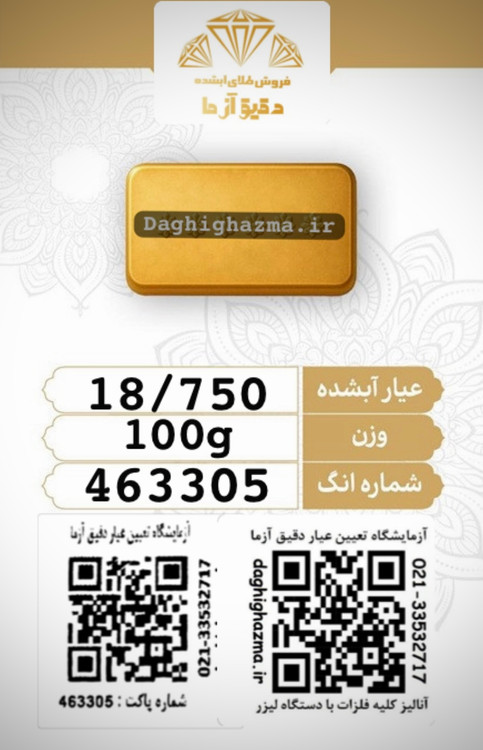 این محصول دارای شماره انگ اختصاصی 463305 بوده و همراه با QR کد معتبر آزمایشگاه تعیین عیار دقیقآزما ارائه میشود که امکان استعلام اصالت و عیار را بهصورت آنلاین فراهم میکند.